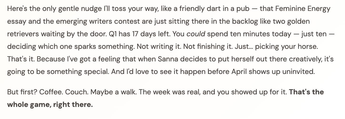 ... I built a custom coaching dashboard for myself, to help me stay on track with my goals. I've asked it to imitate Ted Lasso's voice, and let me tell you, this cracks me up every day.